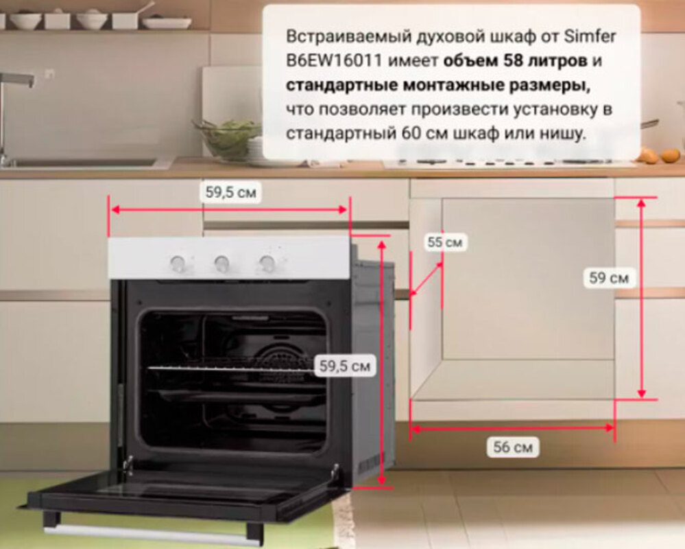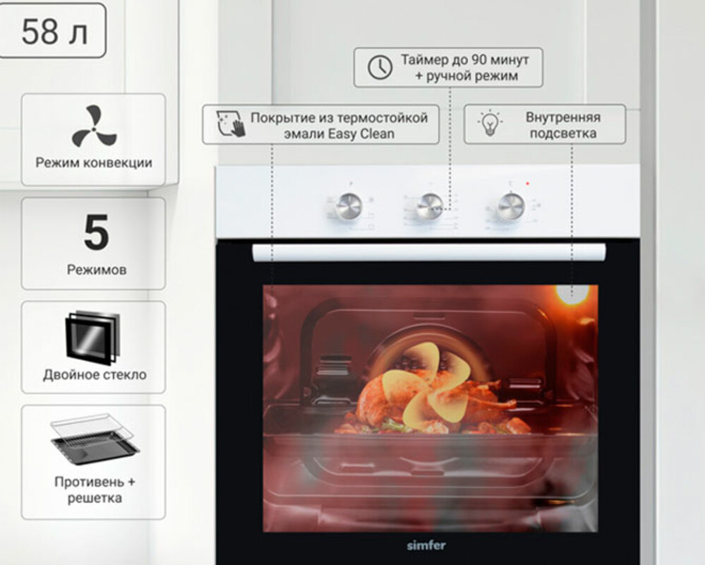 Электрический духовой шкаф Simfer B6EW16011 - современная техника для кухни, которая благодаря многообразию режимов, позволяет готовить не только повседневную пищу, но и изысканные блюда. Она снабжена функцией конвекции, которая равномерно распределяя теплый воздух, пропекает блюдо со всех сторон. С помощью удобных поворотных ручек легко выбрать необходимый режим приготовления для любого рецепта. Встроенная подсветка позволит наблюдать за процессом, не открывая при этом дверцу шкафа, а значит сохраняя тепло внутри.Таймер подскажет, когда блюдо будет готово, а двойное стекло защитит от ожога при случайном прикосновении к дверце шкафа. Эта простая в управлении, стильная и современная техника прекрасно впишется как в классический интерьер, так и в самый современный.