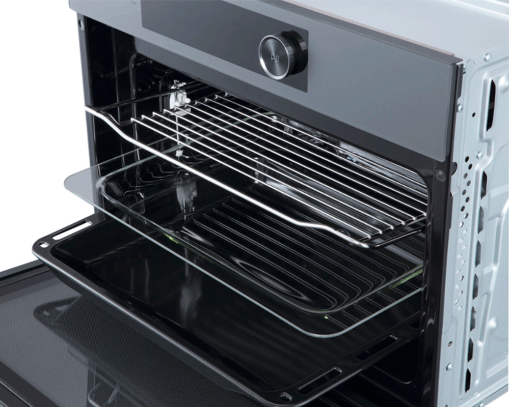 Для расширения возможностей в комплект входят хромированная решётка, противень глубиной 45 мм и стеклянный противень.