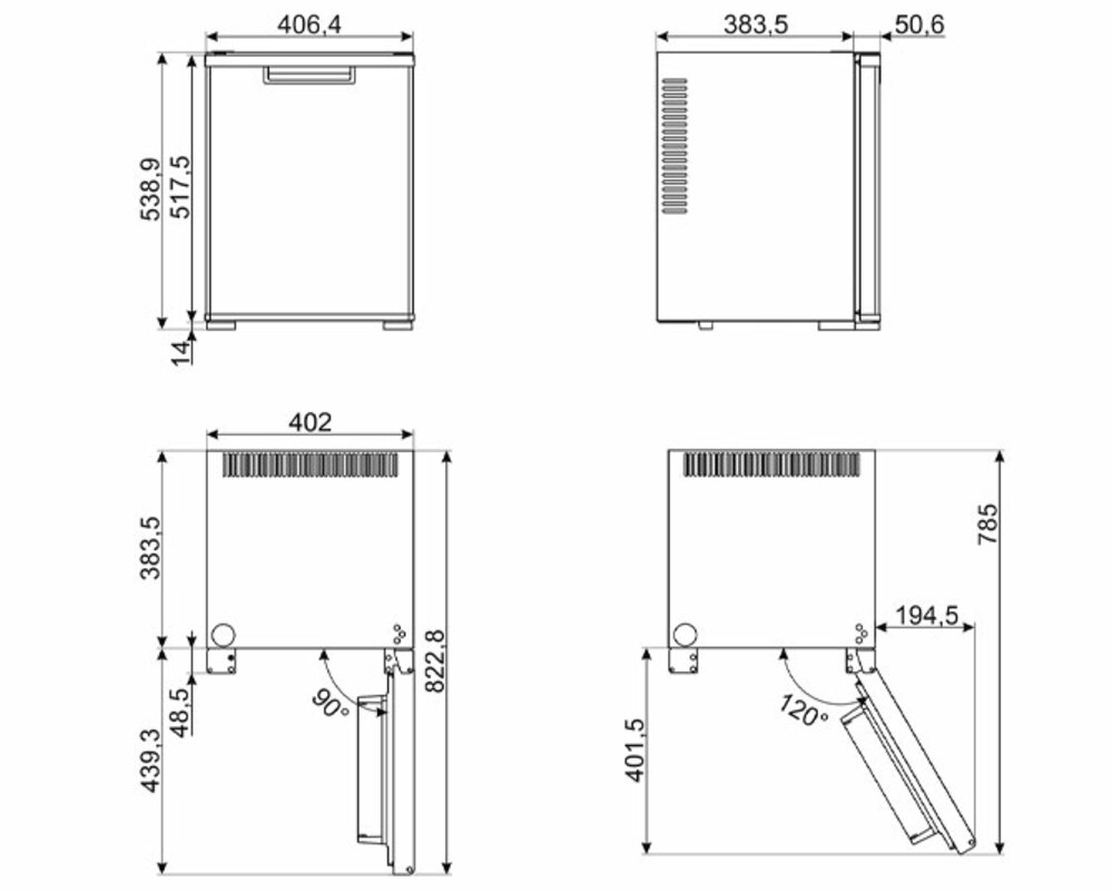 Глубина с дверцей, открытой на 90°: 823 mm
