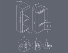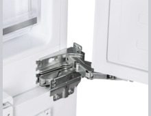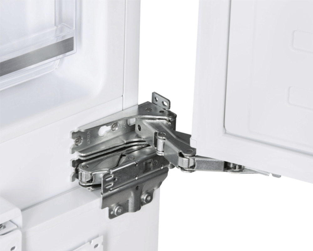 Модель имеет жесткую систему крепления фасадов с фиксированными петлями. При таком монтаже фасады совершенно не связываются с корпусом холодильника. Конструкция имеет высокую жесткость, не ограничена углом открывания и не имеет зазоров, в которых может скапливаться пыль и грязь.