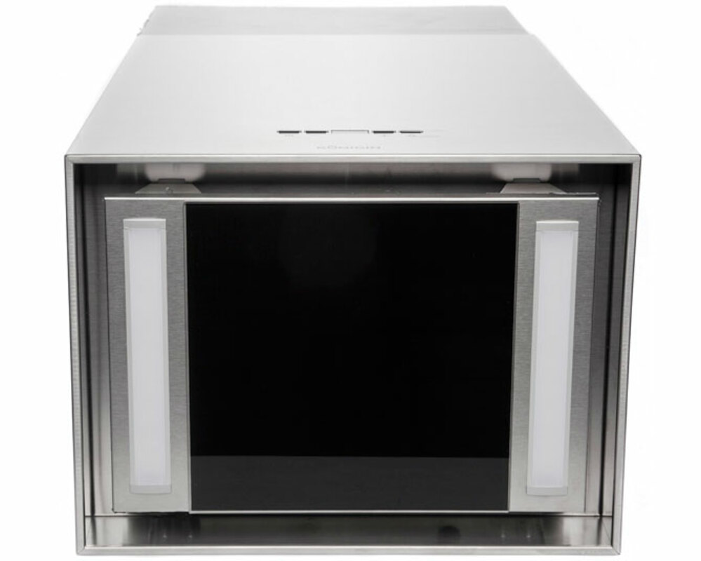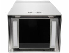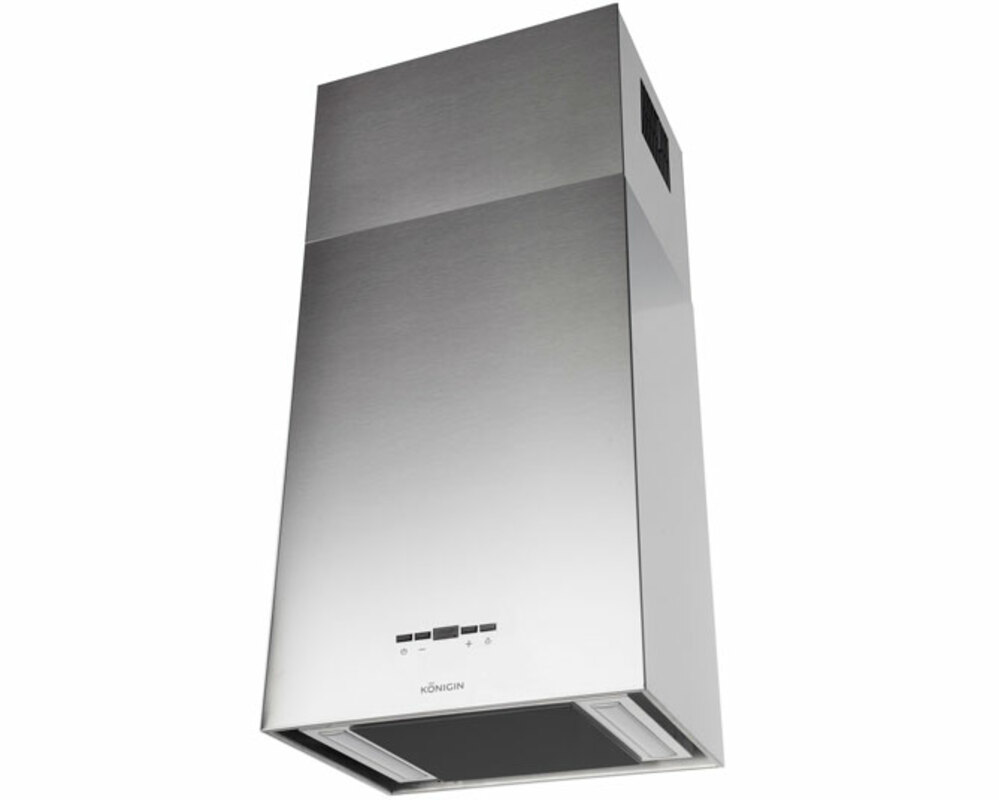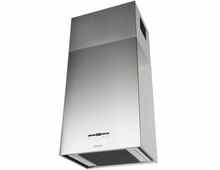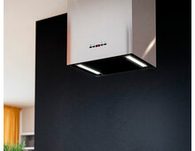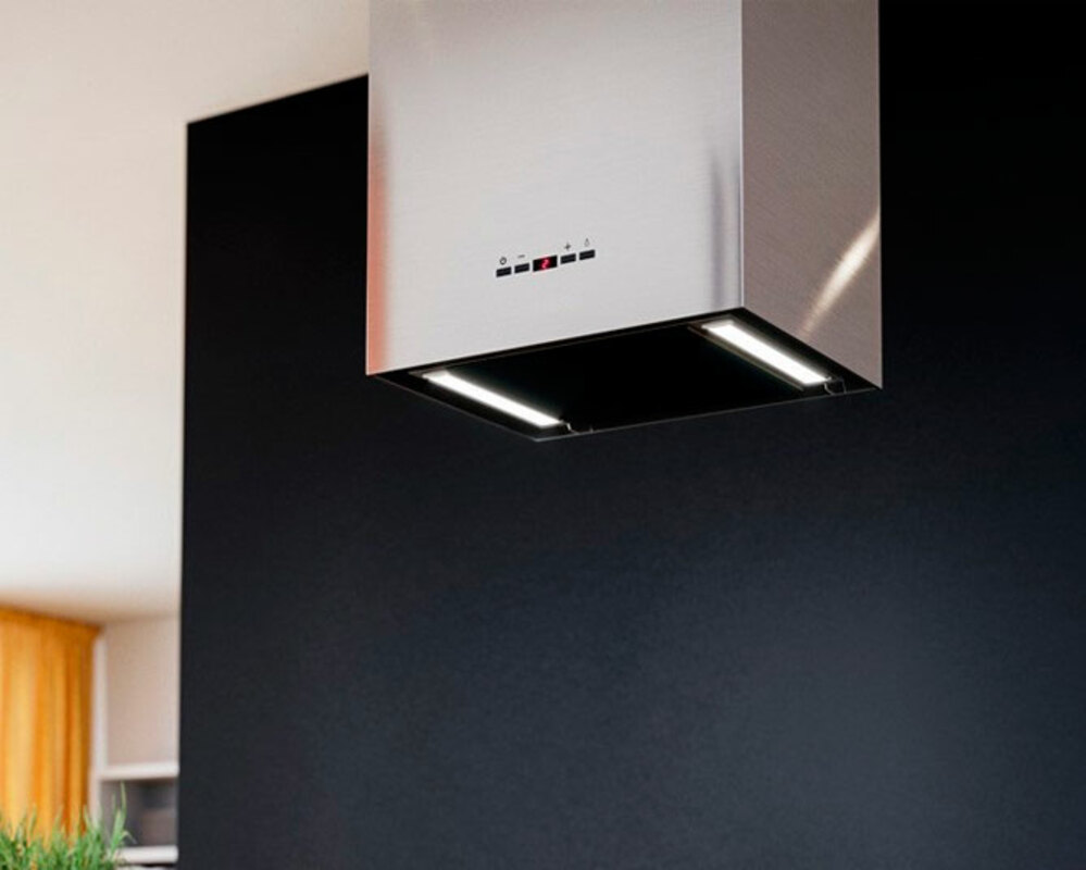 Дизайнерская островная вытяжка в форме прямоугольного параллелепипеда становится центральным вертикальным элементом, связывающим дизайн кухни воедино. Стильное сочетание нержавеющей стали «сатин» и блеска закаленного стекла создают ощущение легкости прочной конструкции. Декоративный стеклянный люк скрывает алюминиевый, жироулавливающий фильтр, придавая завершенность композиции.