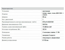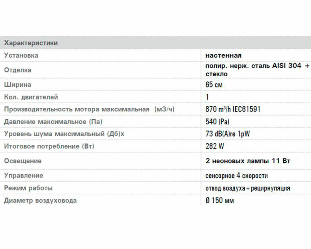 Комплектация Сенсорное управление 4 скорости; Мотор мощностью 870 м3/ч; Неоновые лампы 2х11 Вт