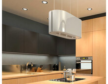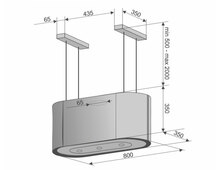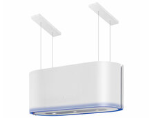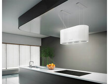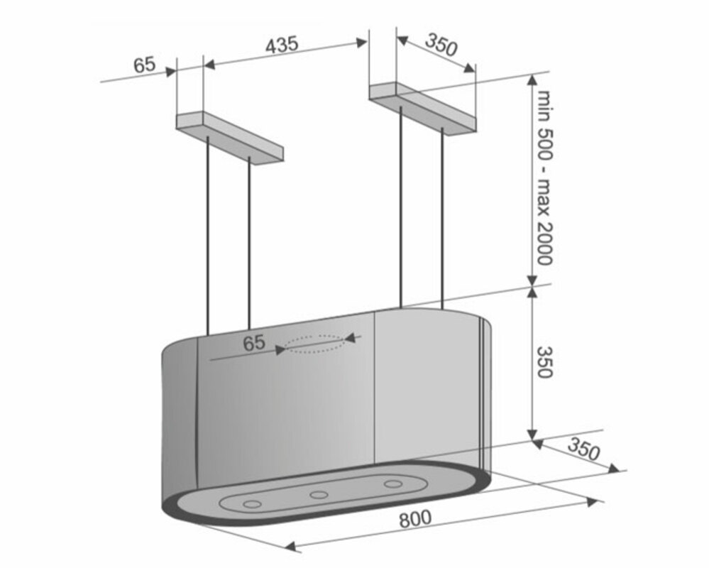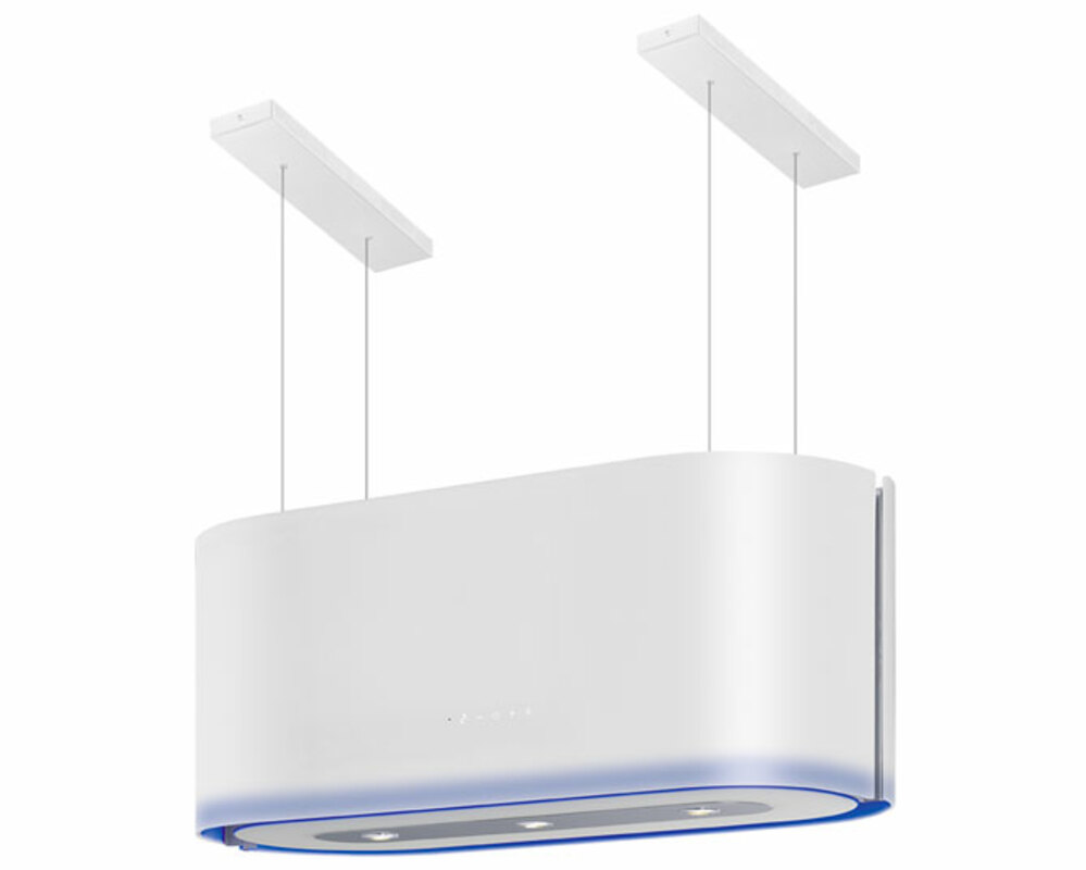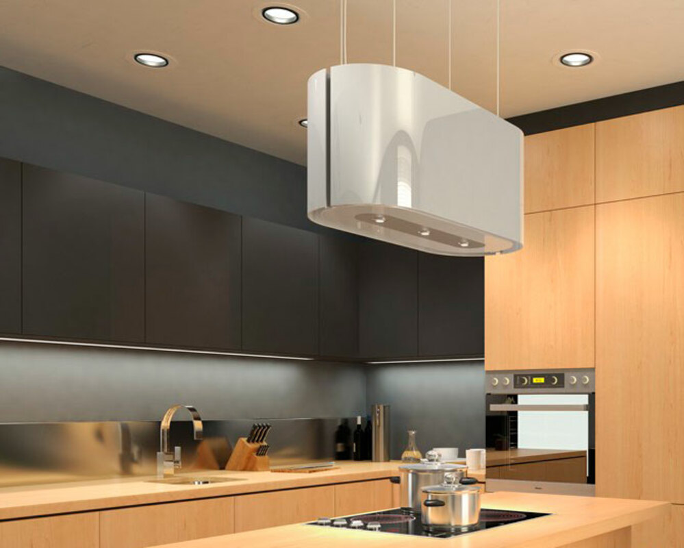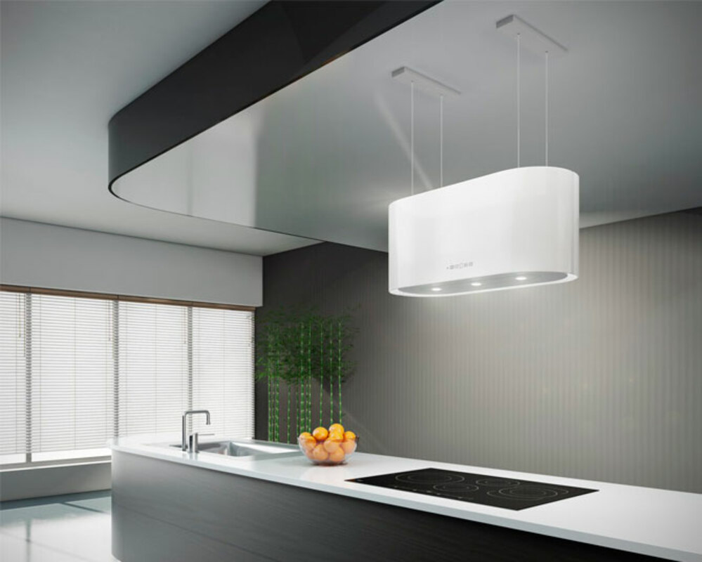 Дизайнерская островная вытяжка на регулируемых по высоте тросах, корпус полностью стеклянный, выполнен в форме эллиптического цилиндра.