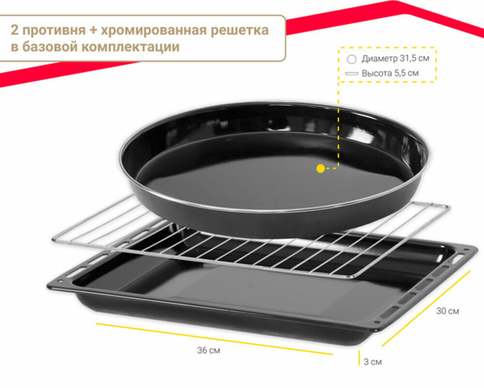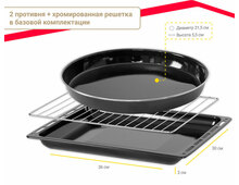 Комплектация стандартный противень, круглый глубокий противень, хромированная решетка, инструкция, гарантийный талон.