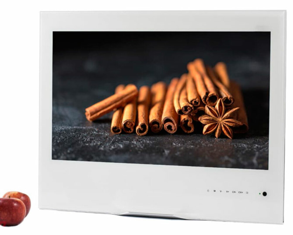 Телевизор в шкафу на кухне может быть установлен в любом удобном месте. Устройство не боится влаги и пара, поэтому будет стабильно работать вблизи мойки, плиты или духовки. Лицевая сторона из закаленного стекла не требует специального ухода, её можно протирать с использованием неабразивных моющих средств.