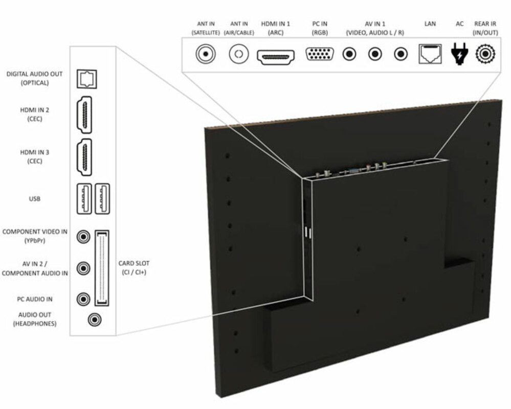CQAX цифровой выход 1 SD 1 HDMI input 2 USB 2 SCART 1 Earphone 1 HDMI 2 TV (75 Ом) аналоговый 1 TV (S2) (DVB-T/T2) 1 Ci+ 1 mini AV 1 RJ45 1 mini YPbPr 1 OTG 1