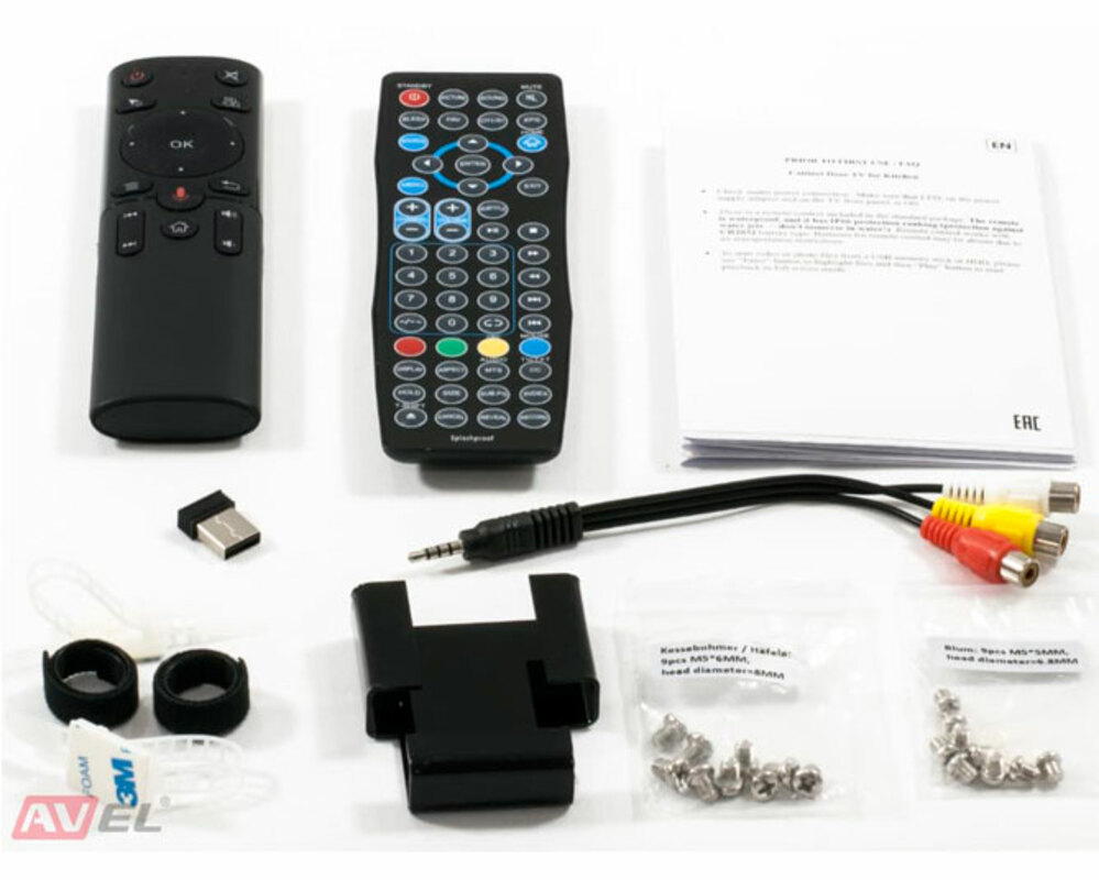 Телевизор на кухню с Wi-Fi комплектуется двумя пультами управления: влагозащищенным и air mouse. Кроме того, на лицевой панели есть сенсорные кнопки для управления основными настройками телевизора (включение, регулировка звука, переключение каналов и др.).