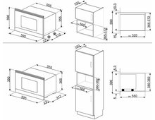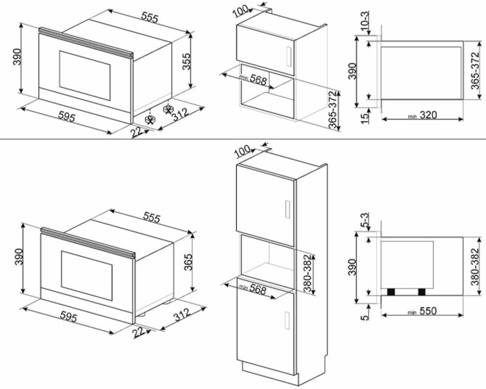 Печь рассчитана на установку в шкаф шириной 60 см (встраиваемая ниша 56×38 см), общий объём камеры — 22 литра.