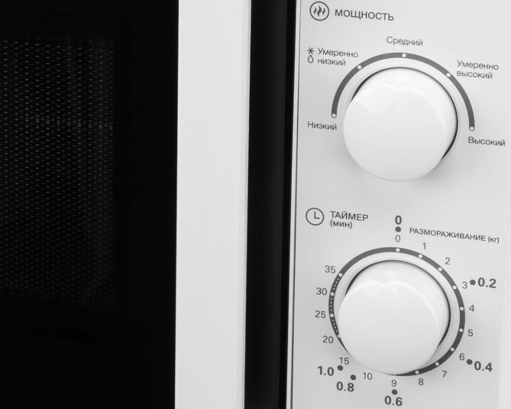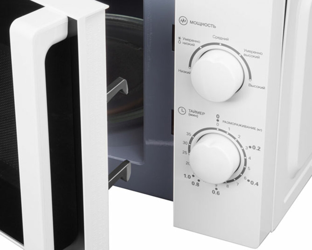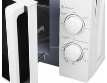 Объем камеры равен 20 л, чего достаточно для небольшой семьи или офиса. Имеет механическое управление: переключатели мощности, времени и выполняемой операции расположены на передней панели.
