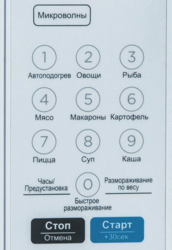 разогрев, размораживание, программирование приготовления, поэтапная кулинария, быстрый пуск «30 сек».