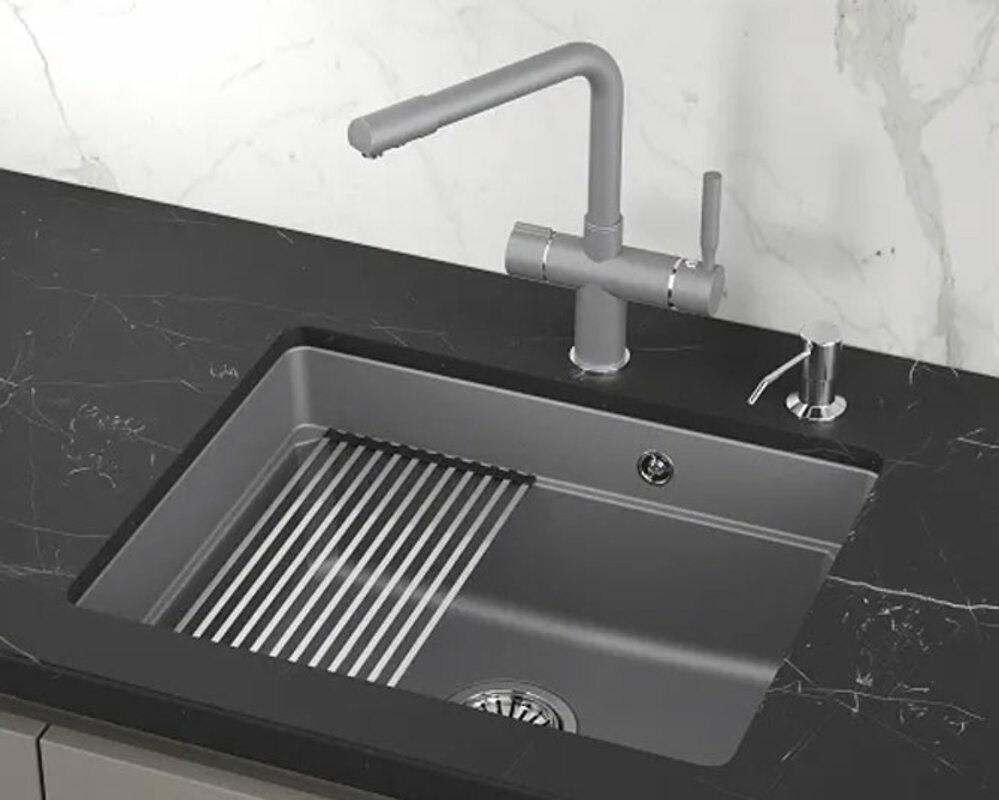 Выполнена из кварцевого композитного материала высокой плотности и гигроскопичности, что обеспечивает не менее 20 лет надежной эксплуатации. Ролл-мат и дозатор из нержавеющей стали идут в комплекте.