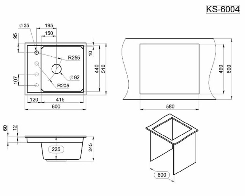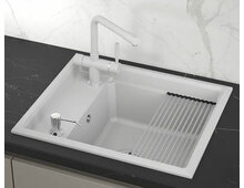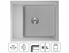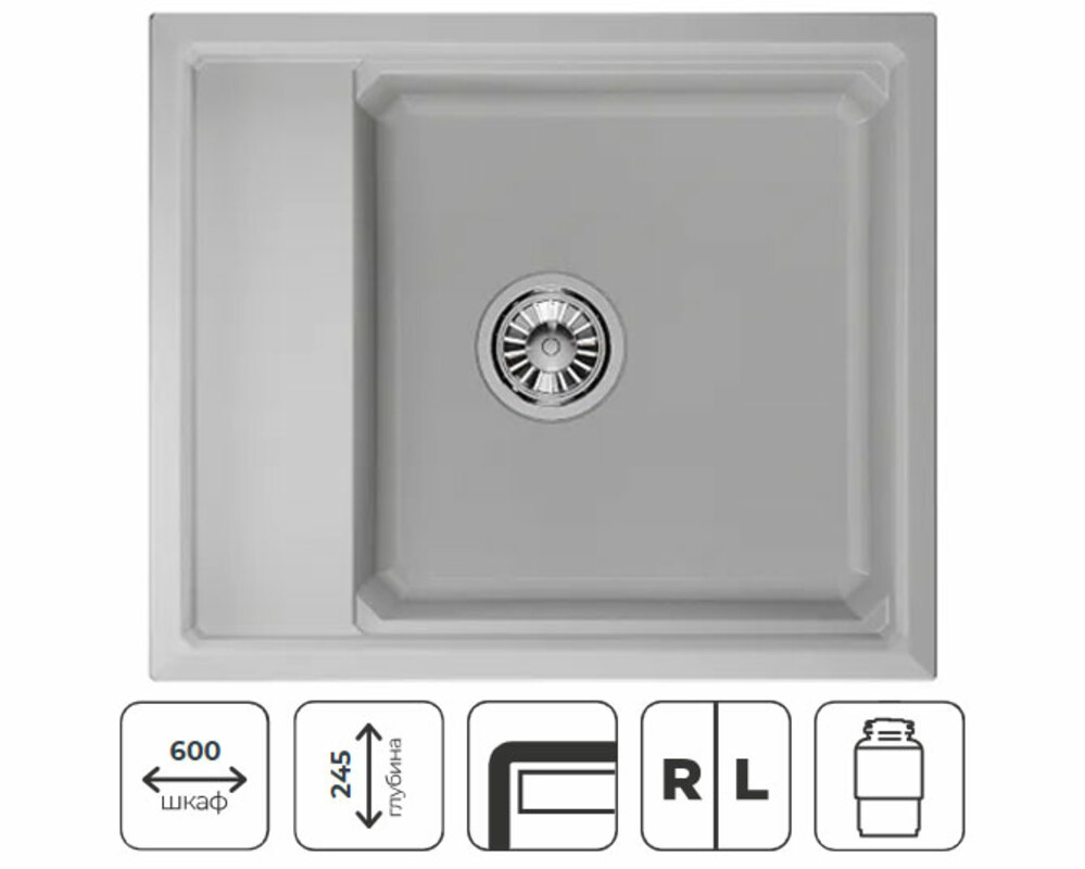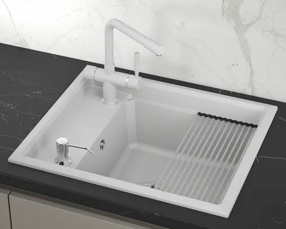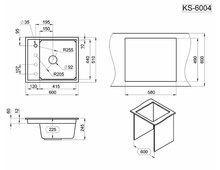Односекционная прямоугольная мойка для установки в шкаф 600 мм с сифоном, дозатором для жидкого мыла из нержавеющей стали и ролл-матом.