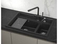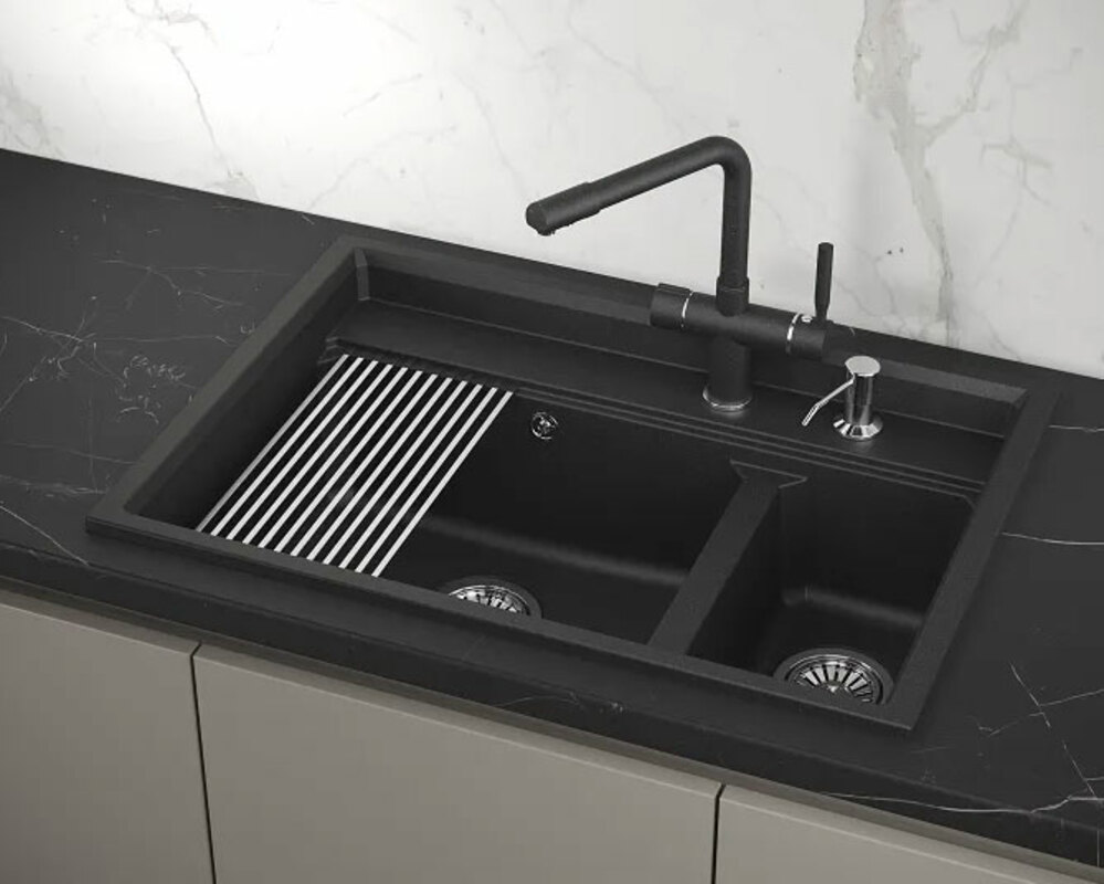Комфорт и практичность на кухне с мойкой Granula! Две чаши - для мойки большой и мелкой посуды, ополаскивания овощей и фруктов. Мойка выполнена из кварцевого песка, прочного и износостойкого материала. Легко моется и не боится пятен. Устойчива к высоким температурам и идеально прилегает к столешнице. В комплекте: ролл-мат, дозатор жидкого мыла, сифон (слив, перелив), инструкция и гарантийный талон.