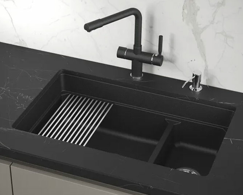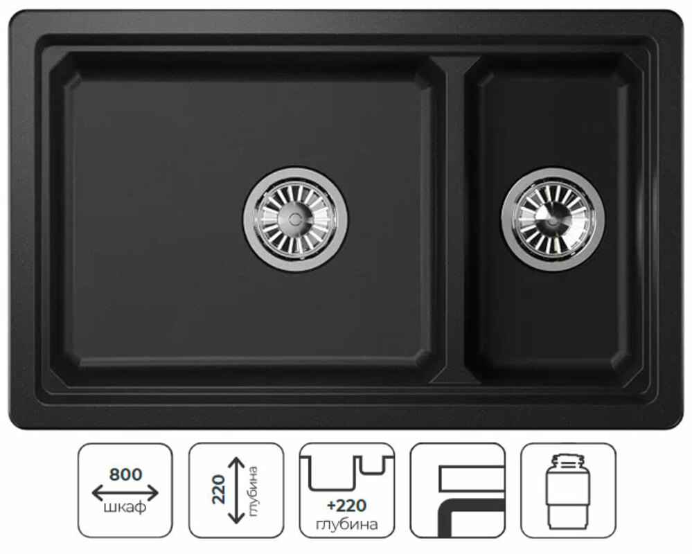 Двухсекционная кухонная мойка прямоугольной формы для установки под столешницу в шкаф 800мм.