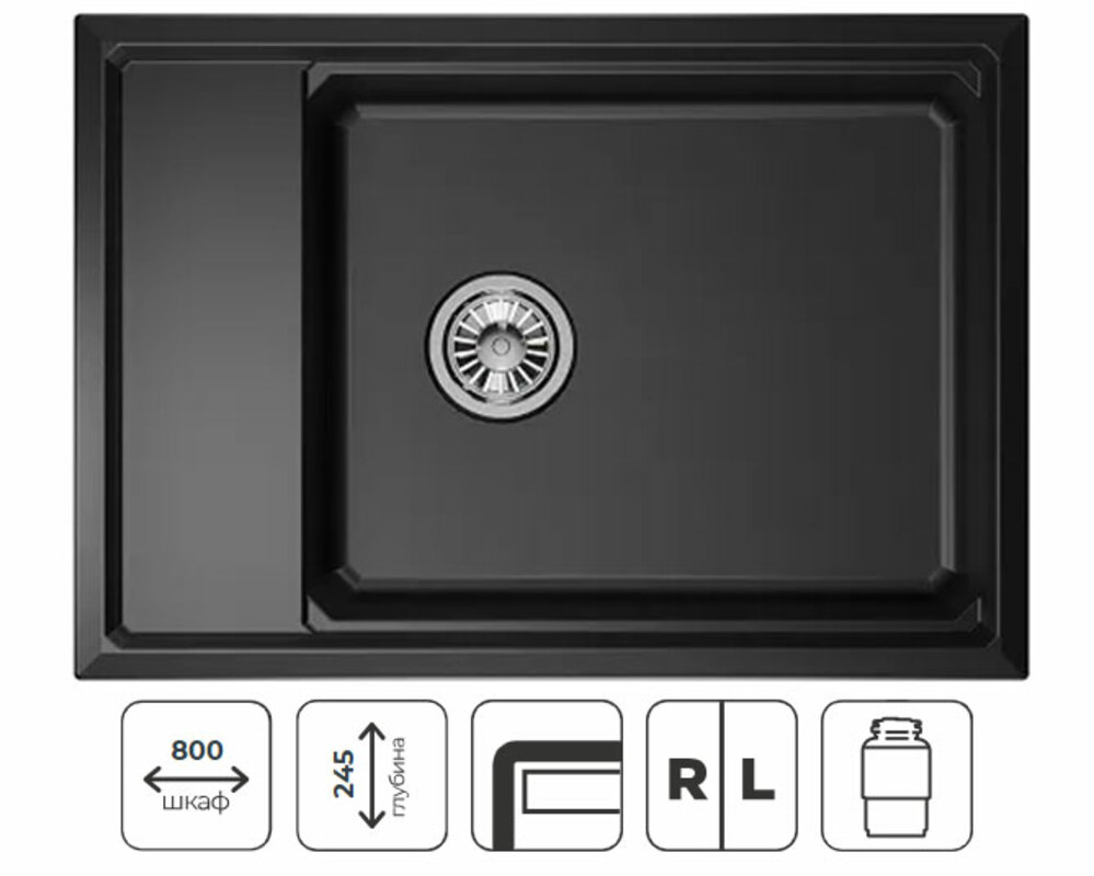 Односекционная прямоугольная мойка для установки в шкаф 800 мм с сифоном, дозатором для жидкого мыла из нержавеющей стали и ролл-матом.