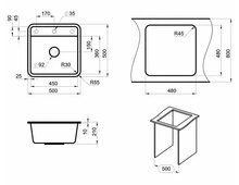 Врезная мойка имеет квадратную форму и размер 500 на 500 мм, что позволяет использовать ее в широком диапазоне кухонных помещений.