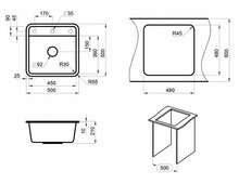 Врезная мойка имеет квадратную форму и размер 500 на 500 мм, что позволяет использовать ее в широком диапазоне кухонных помещений.