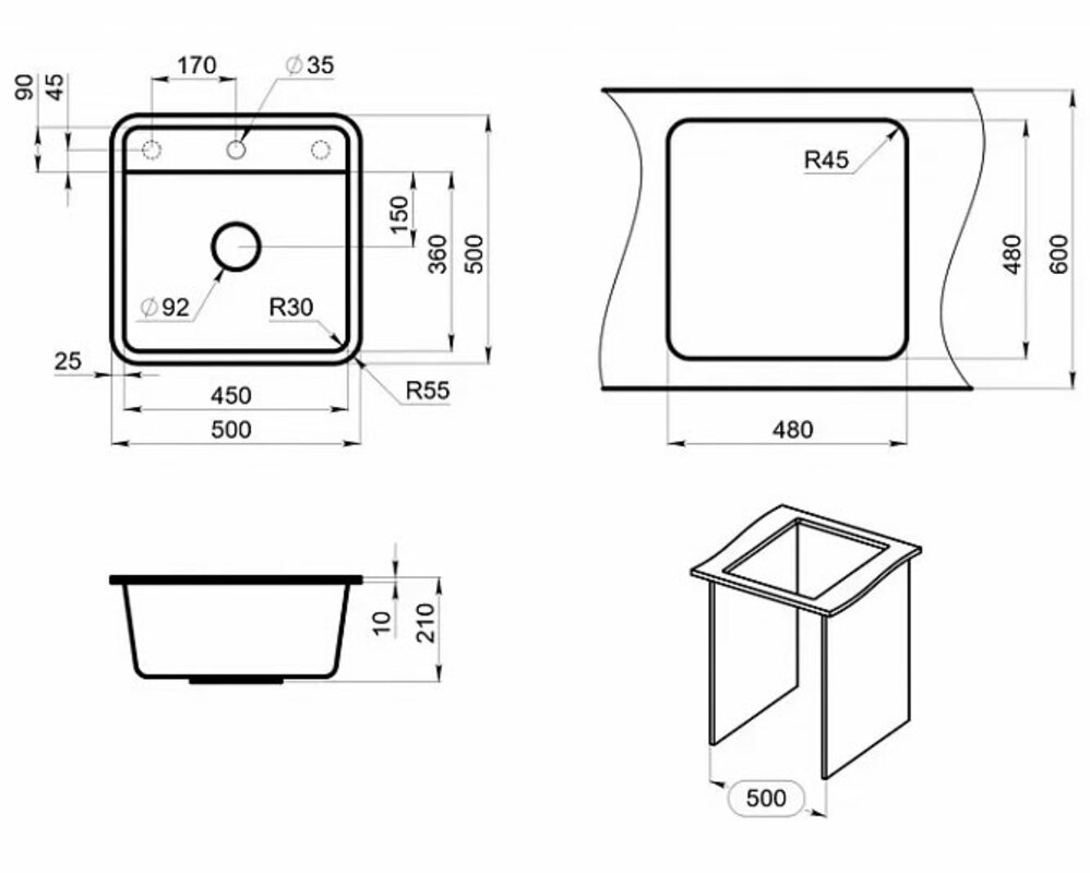 Врезная мойка имеет квадратную форму и размер 500 на 500 мм, что позволяет использовать ее в широком диапазоне кухонных помещений.