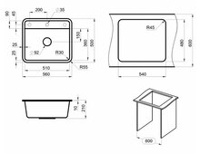 Размер мойки 560 на 500 мм, что идеально подходит для кухонного шкафа 600 мм.