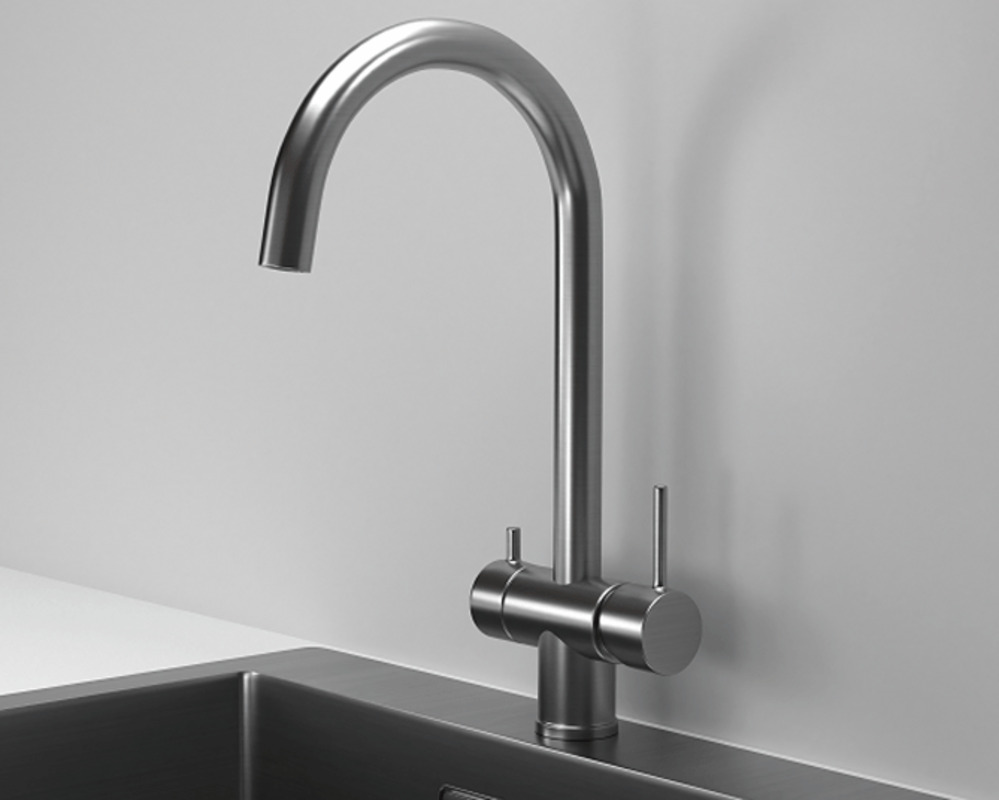 - Смеситель имеет двухканальный корпус, что позволяет использовать его как для обычной, так и для фильтрованной воды. Дополнительный изолированный канал для фильтрованной воды обеспечивает ее чистоту и отсутствие примесей в основном потоке.