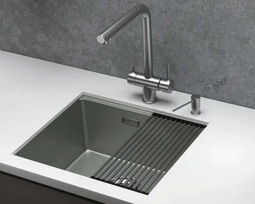 - Дозатор и ролл-мат для удобного хранения моющих средств и губок, что обеспечивает гигиеничность и порядок на кухне;