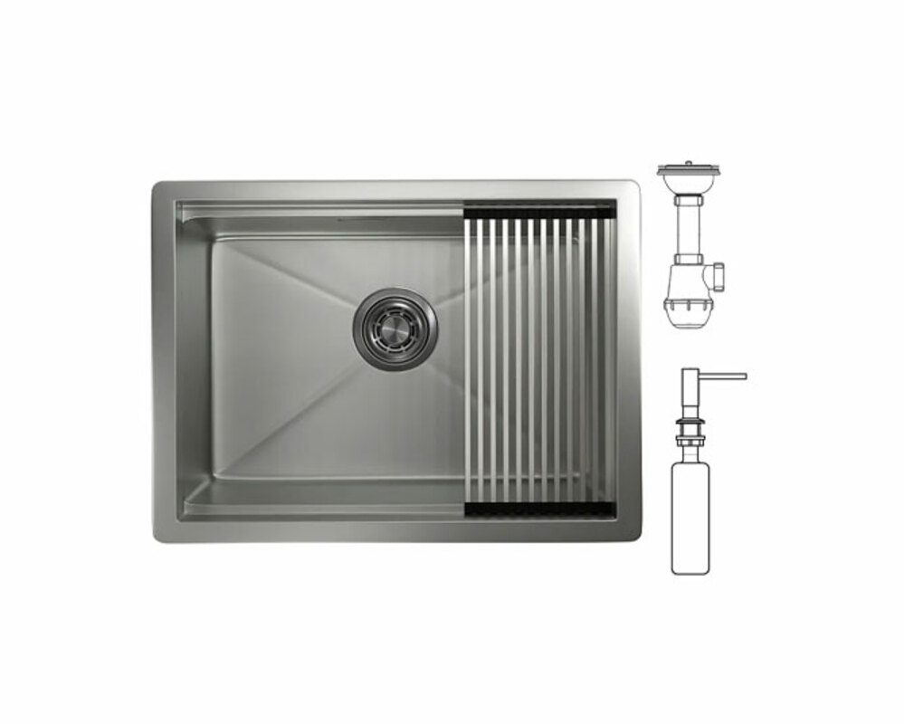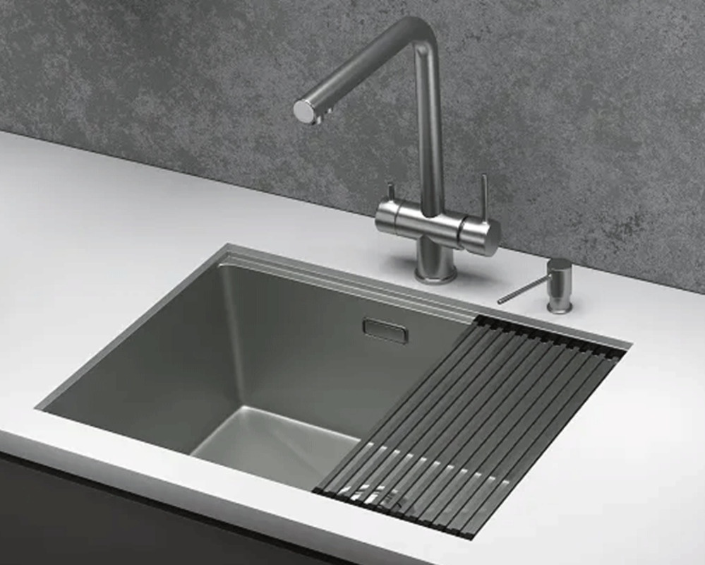 - Дозатор и ролл-мат для удобного хранения моющих средств и губок, что обеспечивает гигиеничность и порядок на кухне;