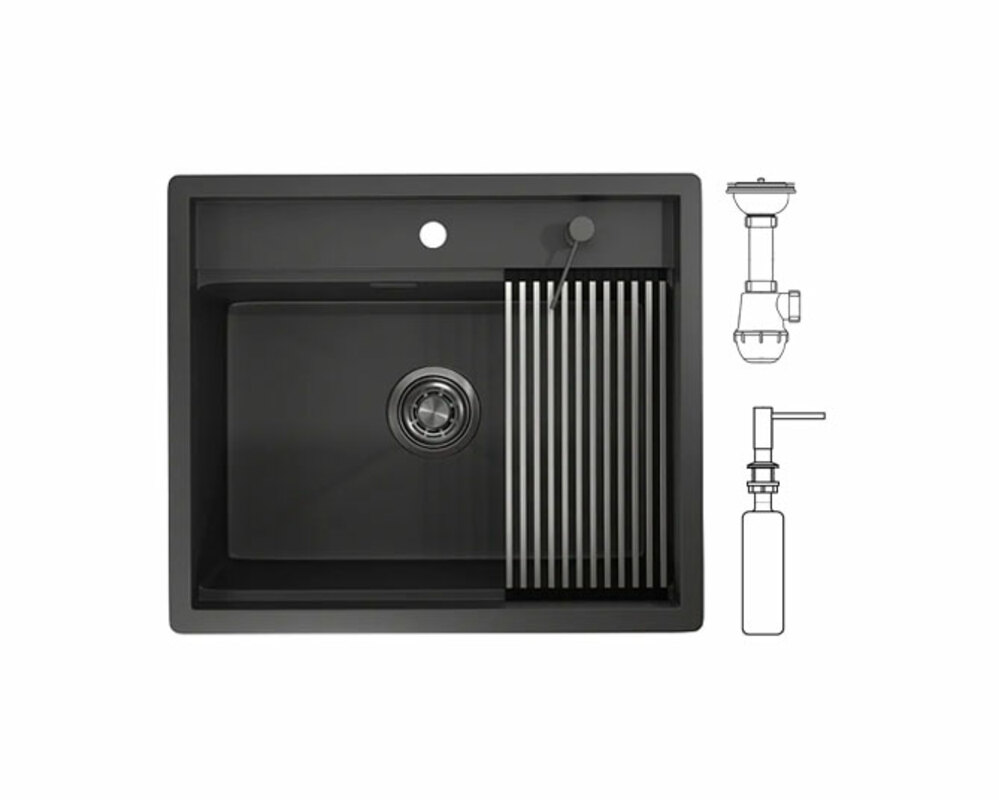 Комплектация: Сифон, комплект креплений, дозатор для жидкого мыла (нерж) и ролл-мат