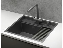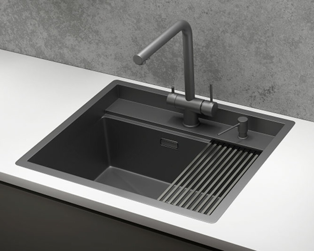 - Дозатор и ролл-мат для удобного хранения моющих средств и губок, что обеспечивает гигиеничность и порядок на кухне;