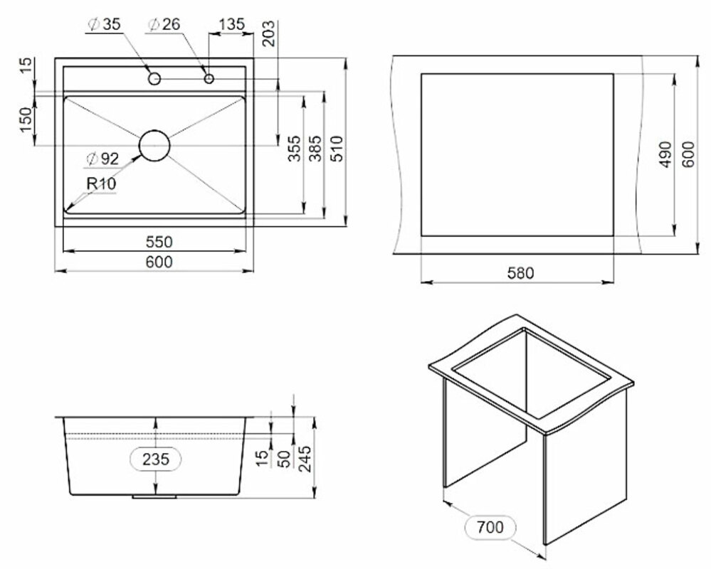 Глубина чаши, мм 235