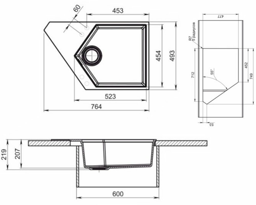 Мойка KitKraken River Graphite тёмно-серый 775х500