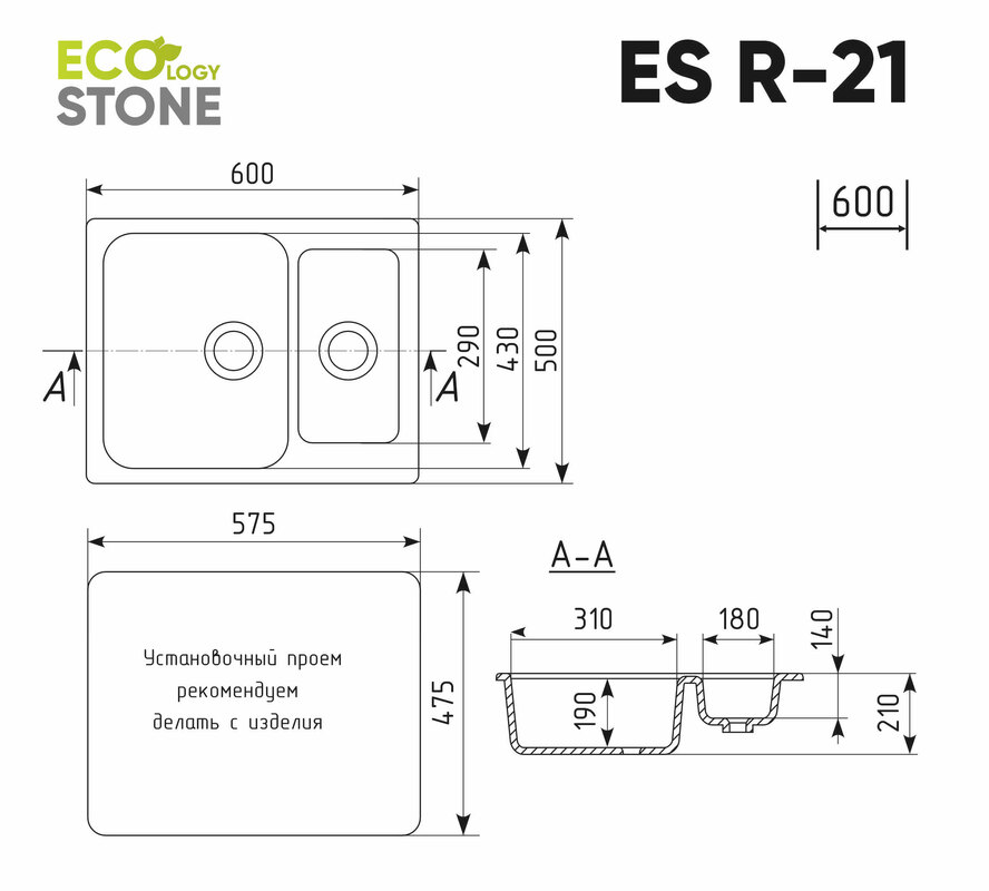 Установочный проем: 575 х 475 мм