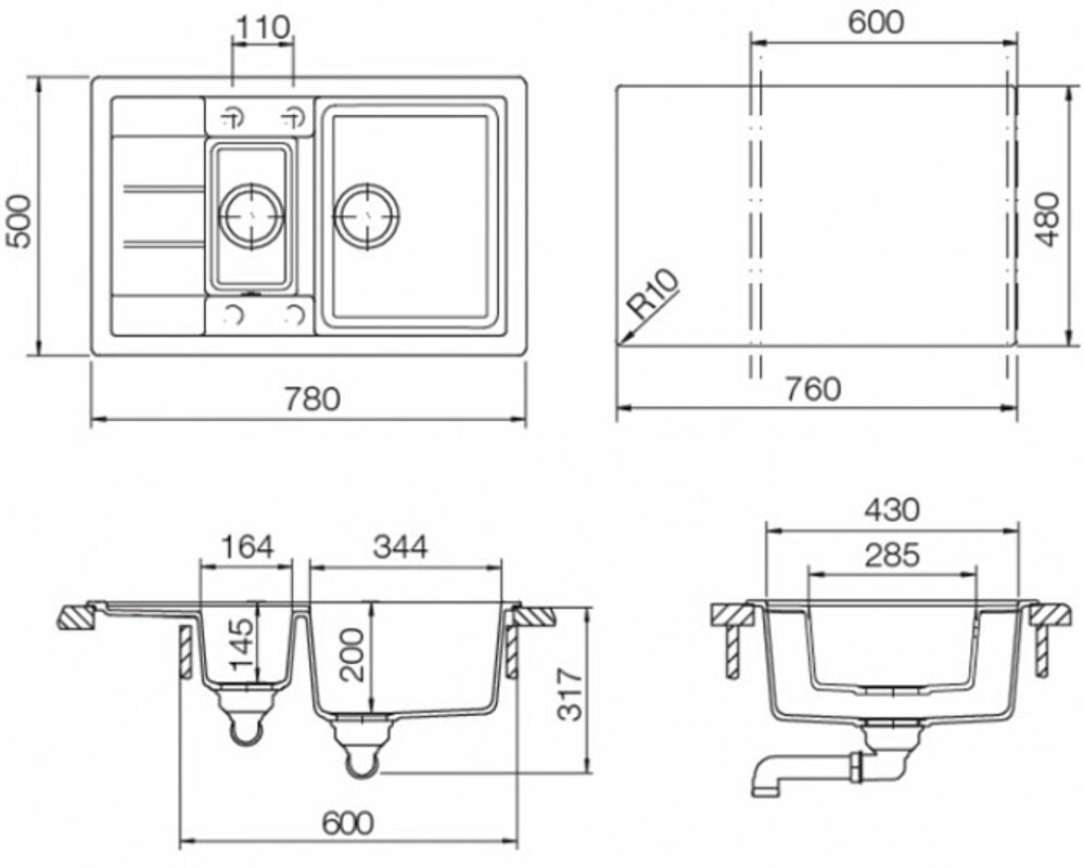 Размеры выреза при установке мойки под столешницу 766х486 R10.