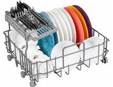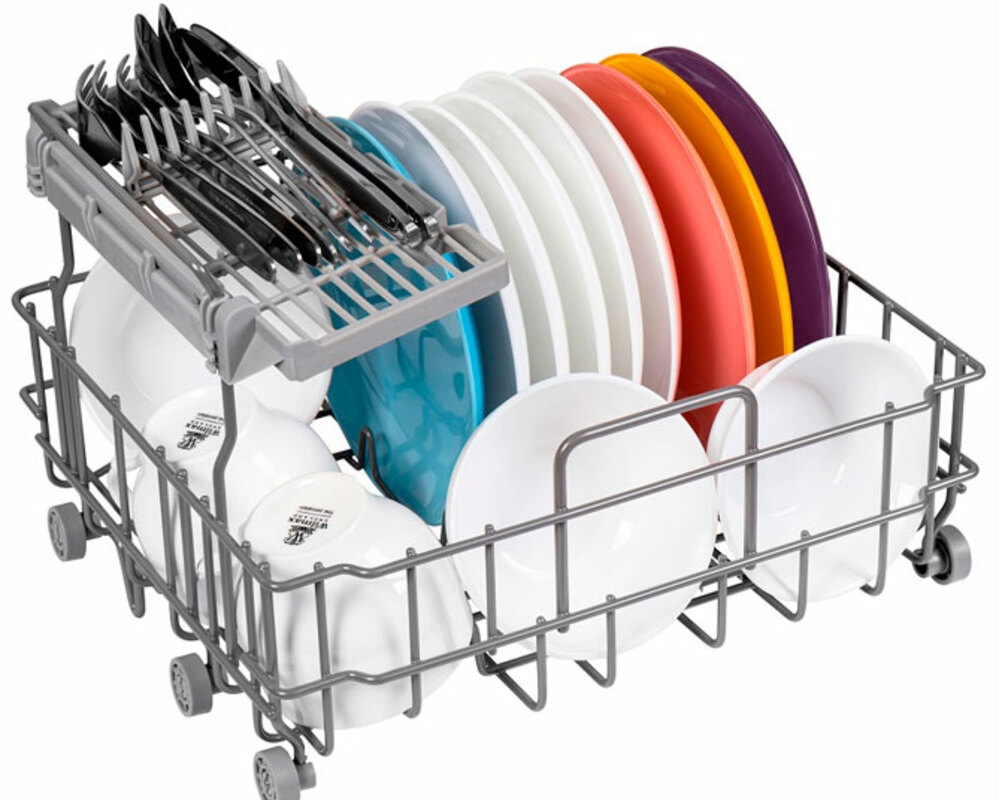 Посудомоечная машина вмещает в себя 3 комплекта посуды (тарелки высотой 270 мм), а также