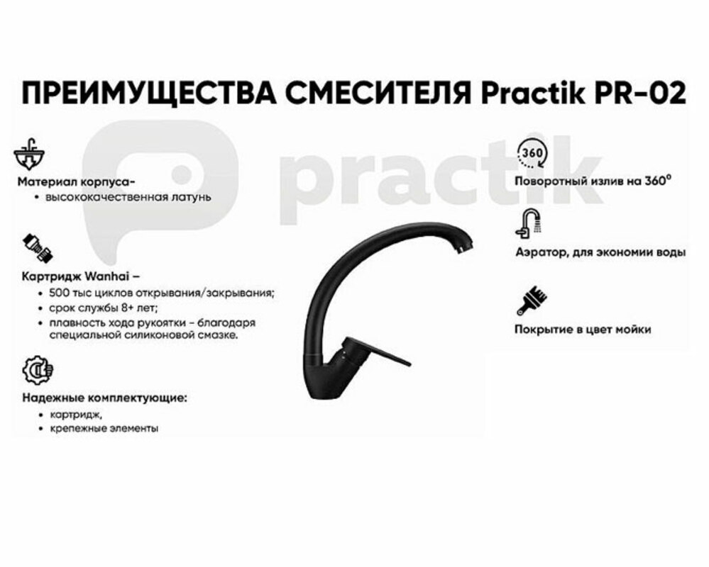 Корпус смесителя изготовлен из высококачественной латуни, а окрашивание под искусственный камень в цвет мойки Practik выполняется на собственном производстве, что позволяет идеально попасть в фирменный цвет Practik.