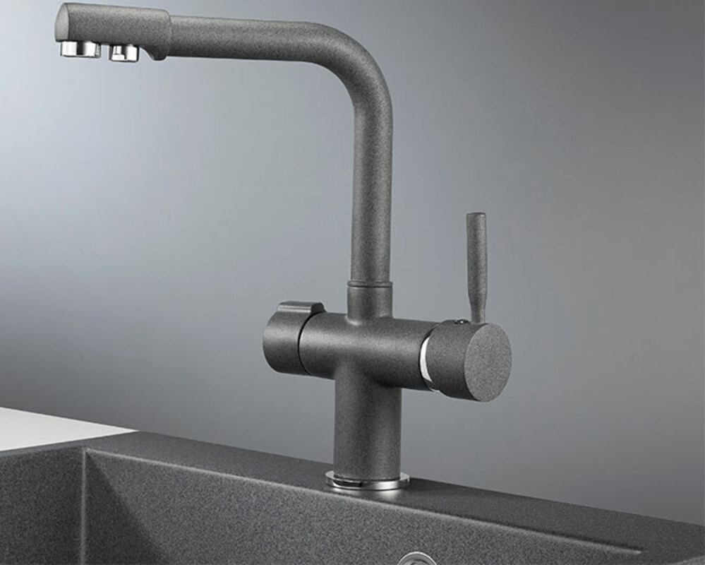 Смеситель для кухонной мойки Granula 2088 изготовлен из высококачественного материала. Латунный корпус обеспечивает длительный срок службы. При этом высокий излив позволяет мыть как мелкую, так и крупногабаритную посуду. Двухрычажная модель смесителя Granula 2088 выполнена с краном для питьевой воды. Фильтрованная вода подается по отдельной трубке и не смешивается с водопроводной водой.
