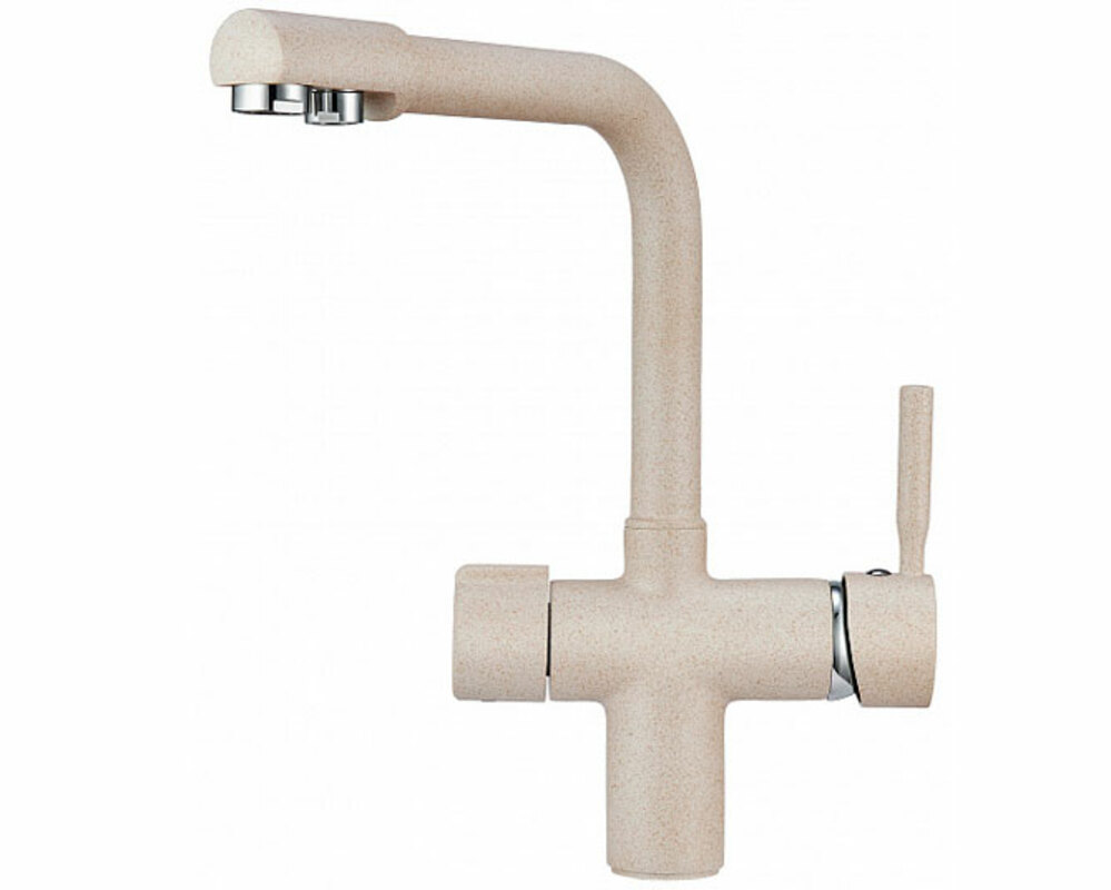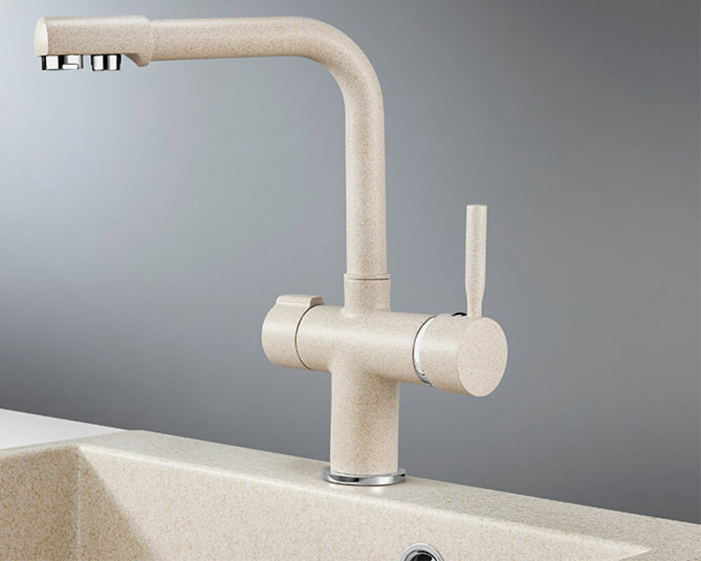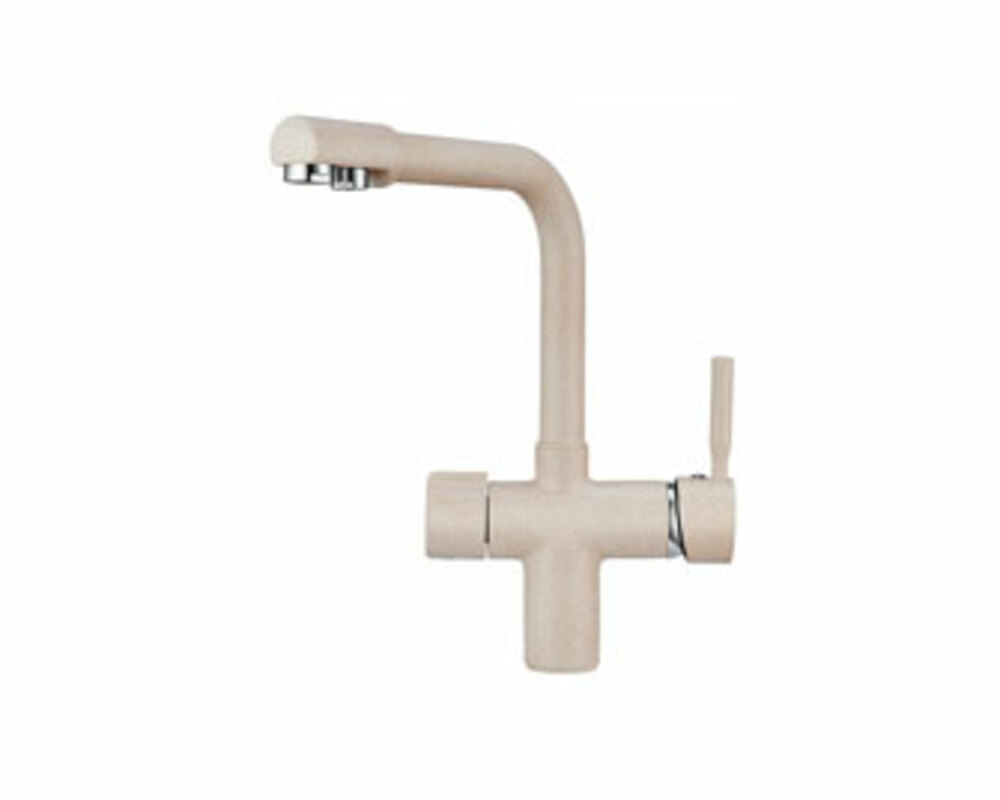 Смеситель для кухонной мойки Granula 2088 изготовлен из высококачественного материала. Латунный корпус обеспечивает длительный срок службы. При этом высокий излив позволяет мыть как мелкую, так и крупногабаритную посуду. Двухрычажная модель смесителя Granula 2088 выполнена с краном для питьевой воды. Фильтрованная вода подается по отдельной трубке и не смешивается с водопроводной водой.