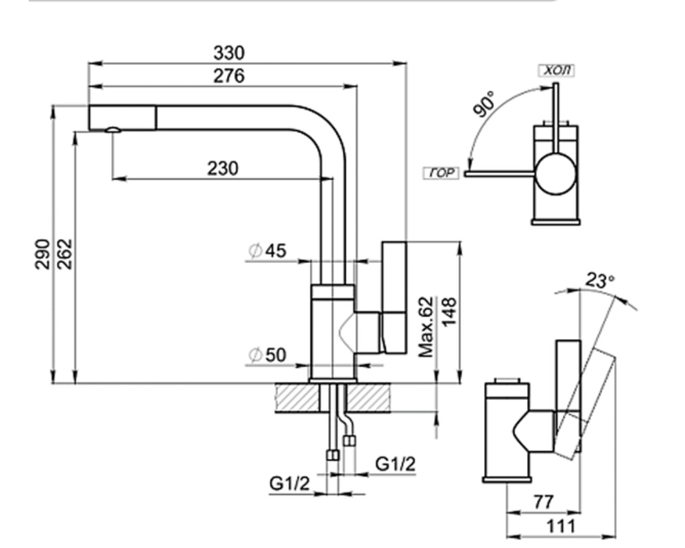 - Комплектация: смеситель, гибкая подводка, комплект креплений