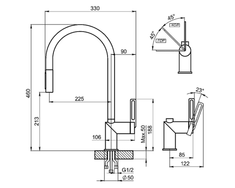 Выдвижной излив – увеличивает охват рабочей зоны и позволяет легко дотянуться до труднодоступных мест.