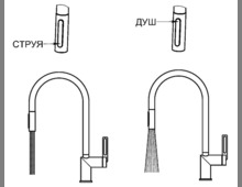 Переключение между режимами подачи воды (душ, лейка) – позволяет снизить расход воды, легче мыть посуду смывать моющее средство благодаря режиму душа.