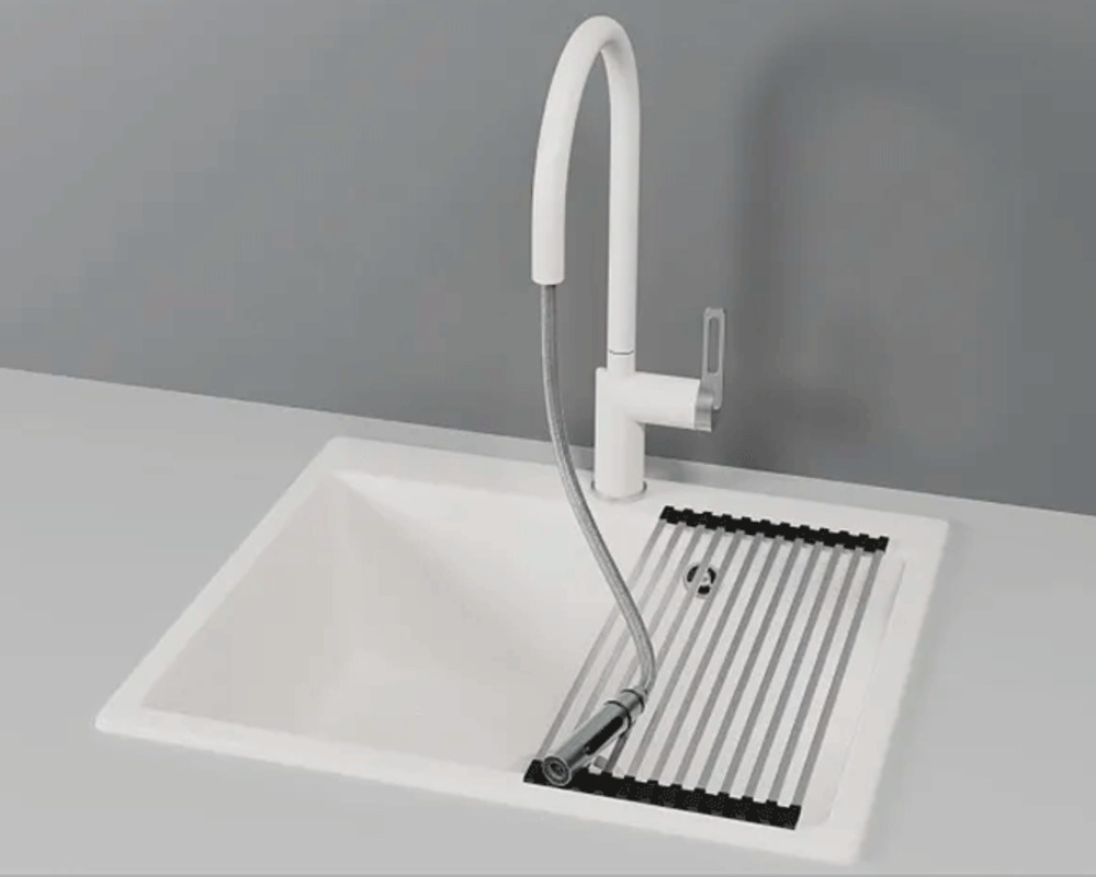 Выдвижной излив – увеличивает охват рабочей зоны и позволяет легко дотянуться до труднодоступных мест.