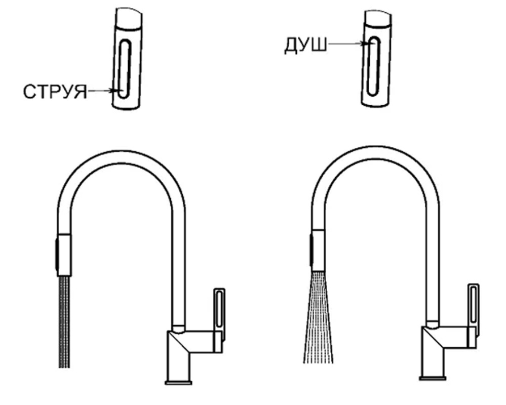 Переключение между режимами подачи воды (душ, лейка) – позволяет снизить расход воды, легче мыть посуду смывать моющее средство благодаря режиму душа.