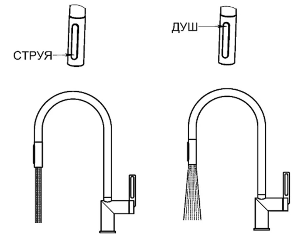 Переключение между режимами подачи воды (душ, лейка) – позволяет снизить расход воды, легче мыть посуду смывать моющее средство благодаря режиму душа.