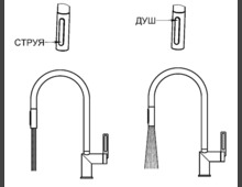 Переключение между режимами подачи воды (душ, лейка) – позволяет снизить расход воды, легче мыть посуду смывать моющее средство благодаря режиму душа.