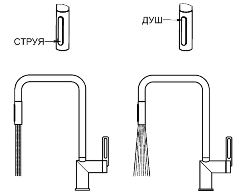Переключение между режимами подачи воды (душ, лейка) – позволяет снизить расход воды, легче мыть посуду смывать моющее средство благодаря режиму душа.