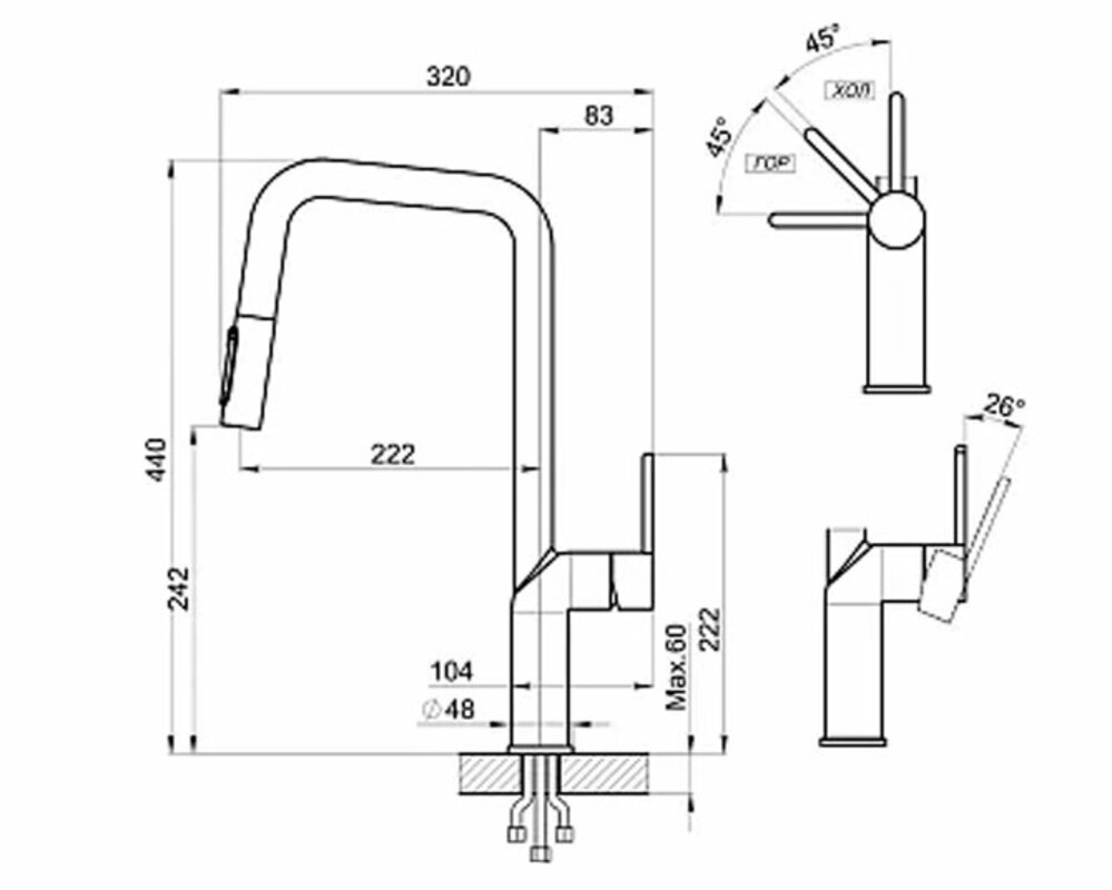 * Поворот на 360° + выдвижной излив — удобно для двухчашевых моек, высоких кастрюль, овощей