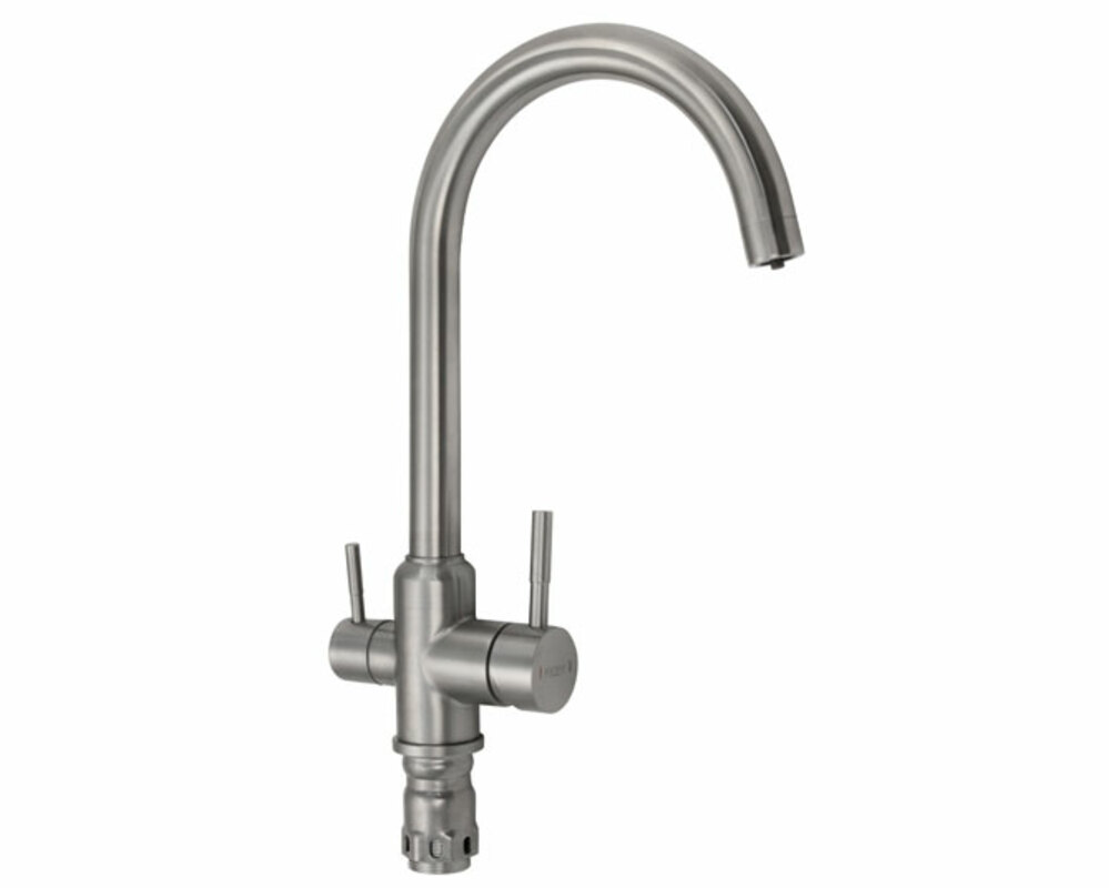 Смеситель для кухонной мойки и раковин с двойным выпуском воды для фильтра, литой матовый корпус, из нержавеющей стали марка 304, с высоким С-образным изливом, шаровый, Крепление резьба - гайка, картридж d = 40 мм, ручка шток, Аэратор для экономии воды. Такая модель может использоваться на домашней кухне, на даче, в медицинских учреждениях и общественных местах. Габаритные размеры: высота 370 мм, длина 300 мм, диаметр посадочного седла 50 мм, длина резьбы 60 мм, длина подводки 450 мм, вес - 2,350 кг, объём - 0,00613 м3. В комплекте паспорт, корпус с изливом, подводка 1/2, крепеж, набор прокладок