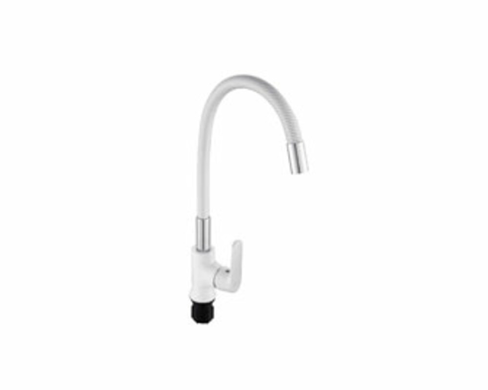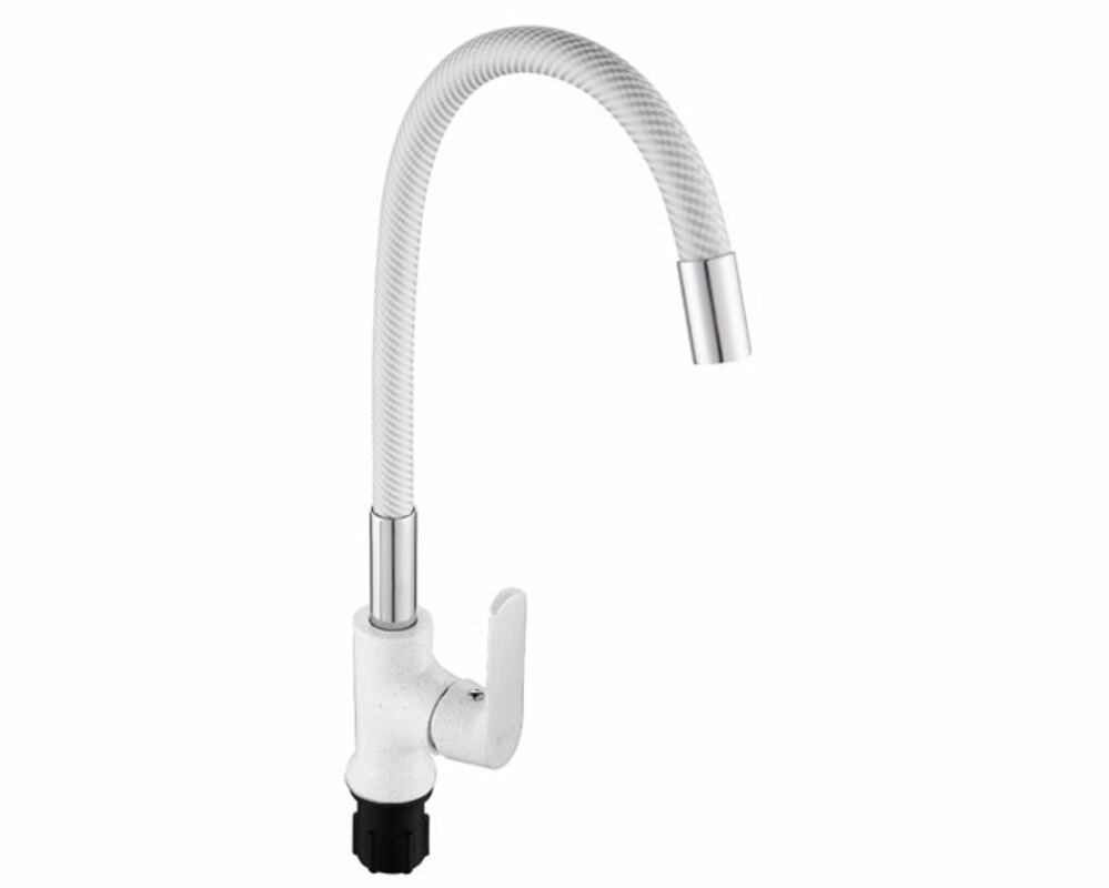 Смеситель для кухонной мойки и раковин, литой корпус белого цвета , с высоким гибким изливом белого цвета, полосатый, с аэратором для экономии воды, шаровый, Крепление резьба - гайка, картридж d = 35 мм, ручка литая, Такая модель может использоваться на домашней кухне, на даче, в медицинских учреждениях и общественных местах. Габаритные размеры: высота 300 - 400 мм, длина 250-350 мм, диаметр посадочного седла 50 мм, длина резьбы 55 мм, длина подводки 400 мм, вес - 1,480 кг, объём - 0,00500 м3. В комплекте паспорт, корпус с изливом, подводка 1/2, крепеж, набор прокладок