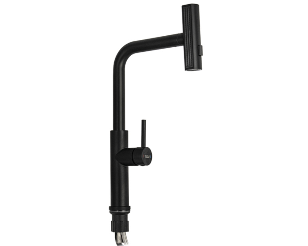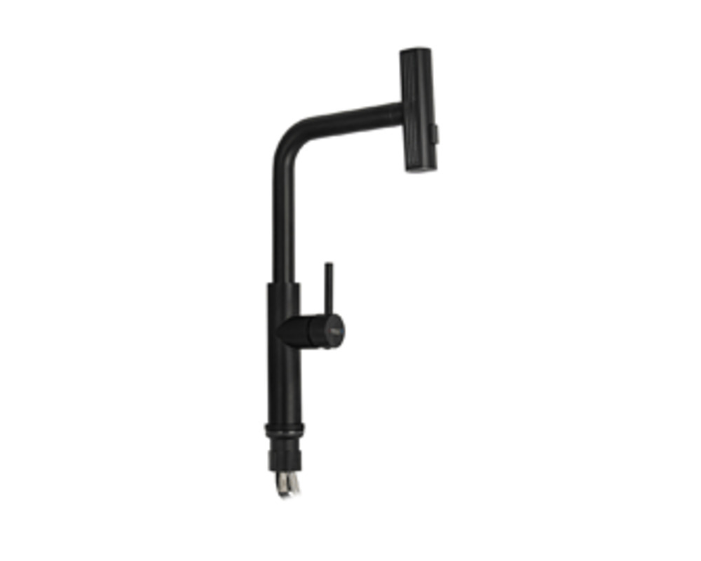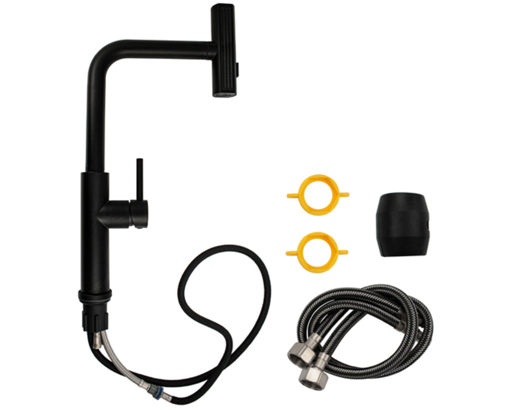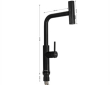 Смеситель для кухонной мойки и раковин, вытяжной излив - лейка с переключением режимов подачи воды, литой матовый корпус, из нержавеющей стали, цвет черный, шаровый.