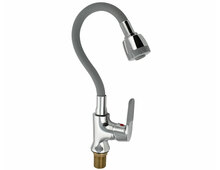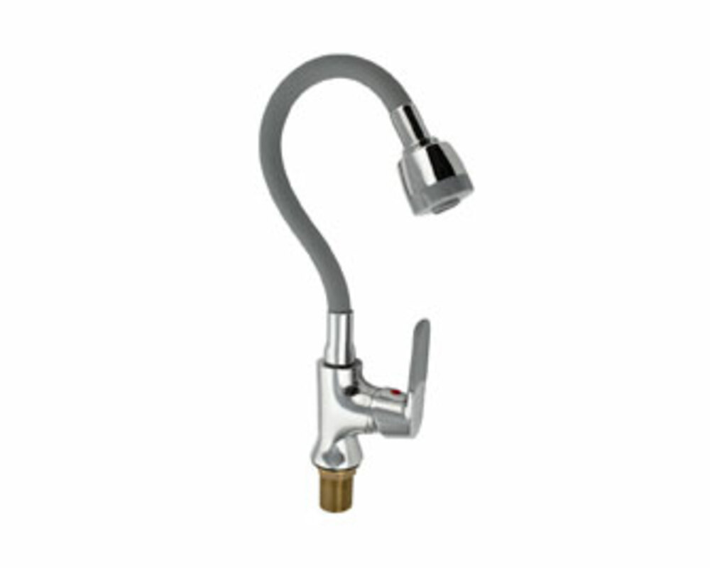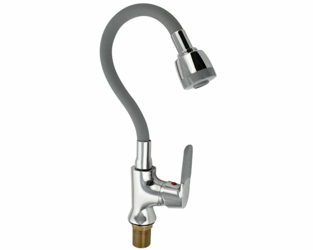 Смеситель для кухонной мойки и раковин, хромированный, боковой, шаровый d = 40 имм, массивный корпус с гибким изливом серого цвета, с двухрежимным аэратором для экономии воды. Крепление резьба - гайка, литая ручка с силиконовой накладкой Габаритные размеры: высота 250-350 мм, длина 180-300 мм, диаметр посадочного седла 50 мм, длина резьбы 50 мм, длина подводки 600 мм, вес - 1,550 кг, объём - 0,00510 м3. В комплекте корпус с изливом, паспорт, подводка 1/2, крепёж .