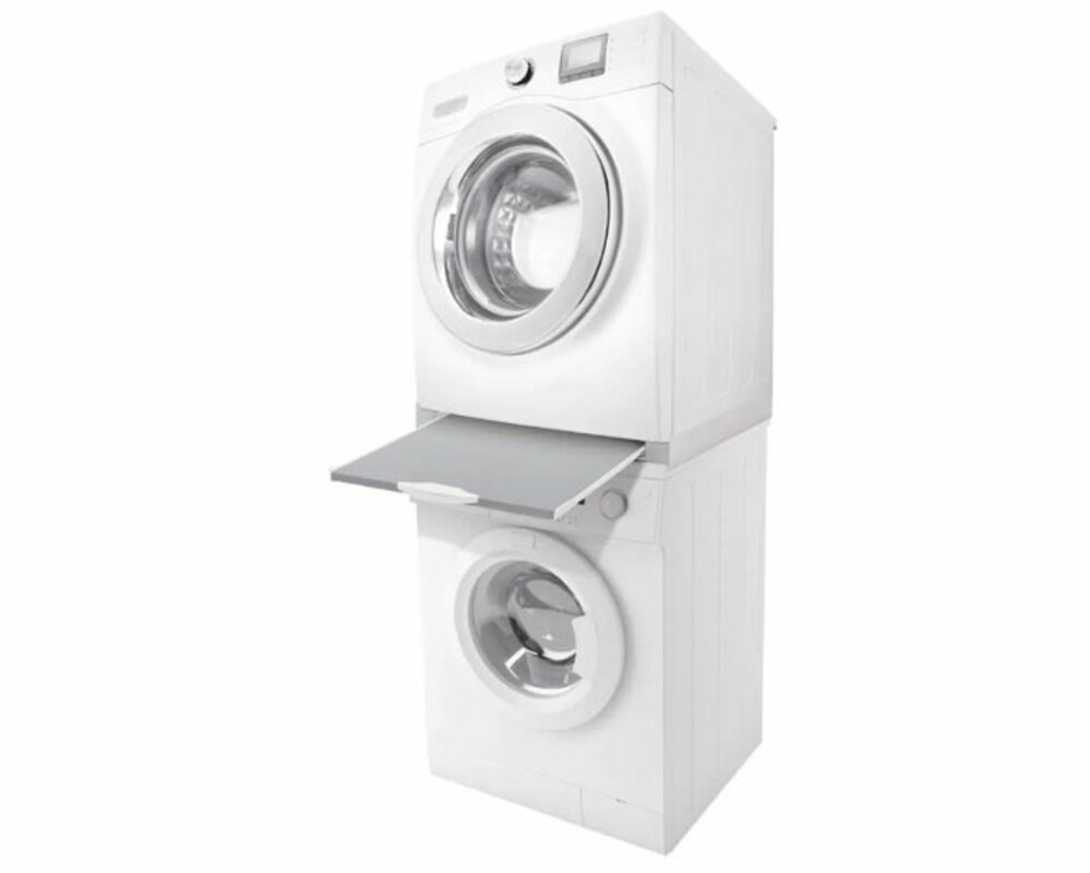 Рама с выдвижной полкой для установки сушильной машины на стиральную позволяет более рационально использовать пространство.